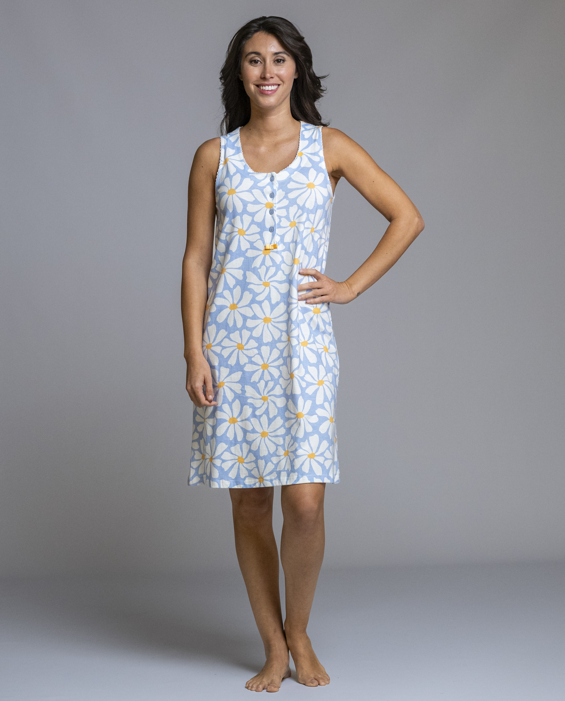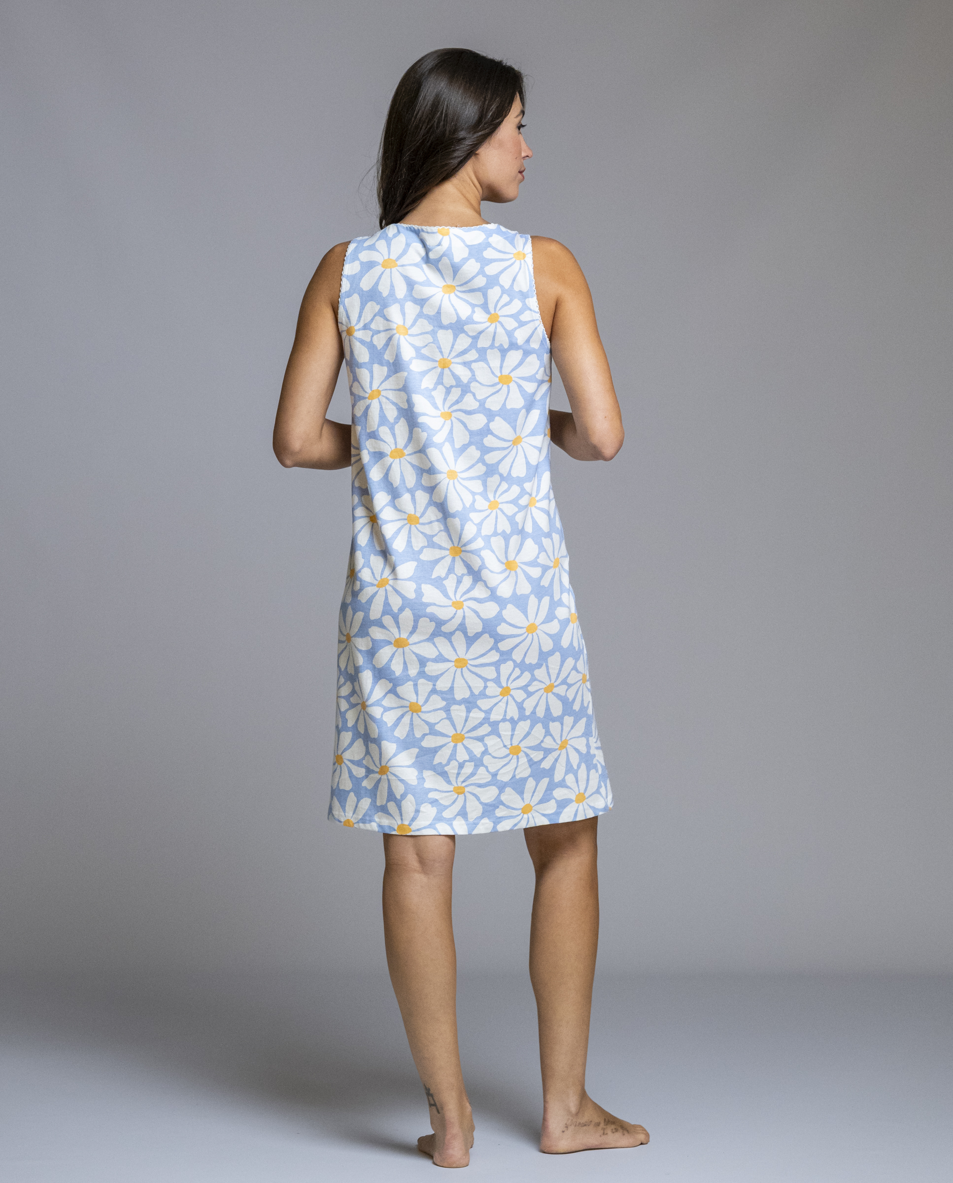 Camisón de mujer de la marca Señoretta, con un delicado estampado floral de margaritas en tonos azules que aporta frescura y luminosidad. Su diseño sin mangas y el escote redondeado con botones resultan muy cómodos para descansar, ofreciendo libertad de movimiento y una sensación agradable durante la noche. Un camisón ligero y suave, ideal para dormir cómoda en los meses más cálidos.