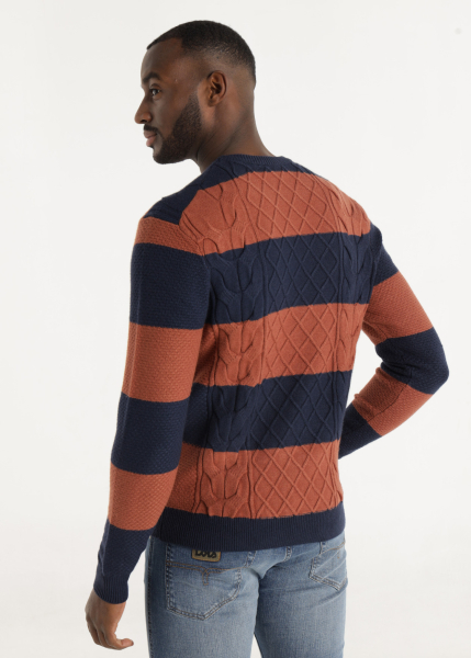 Jersey Lois Jeans para hombre con franjas anchas en color teja y azul marino, tejido con un bonito dibujo trenzado en la parte frontal. De cuello redondo y textura suave, está confeccionado en 52% viscosa, 26% poliéster y 22% nailon, lo que garantiza comodidad, ligereza y un ajuste perfecto. Un modelo versátil que combina el estilo clásico de Lois con un aire moderno, ideal para el día a día o para looks más cuidados en otoño e invierno.