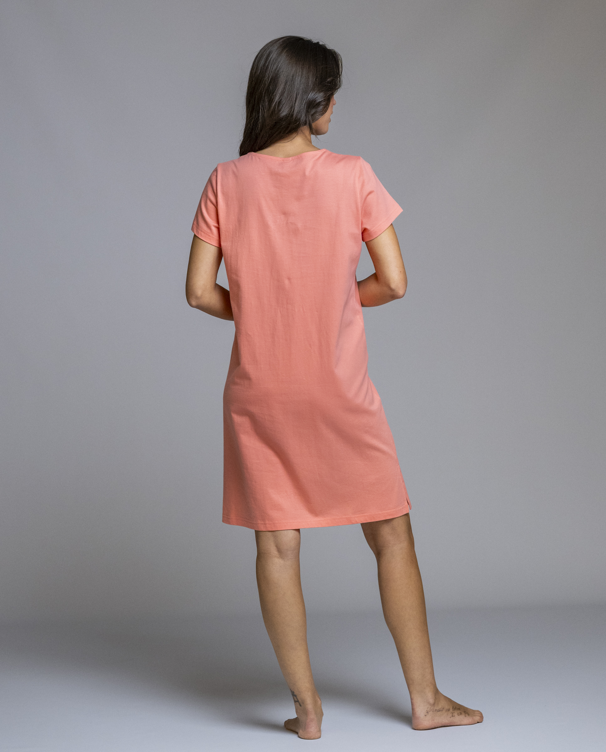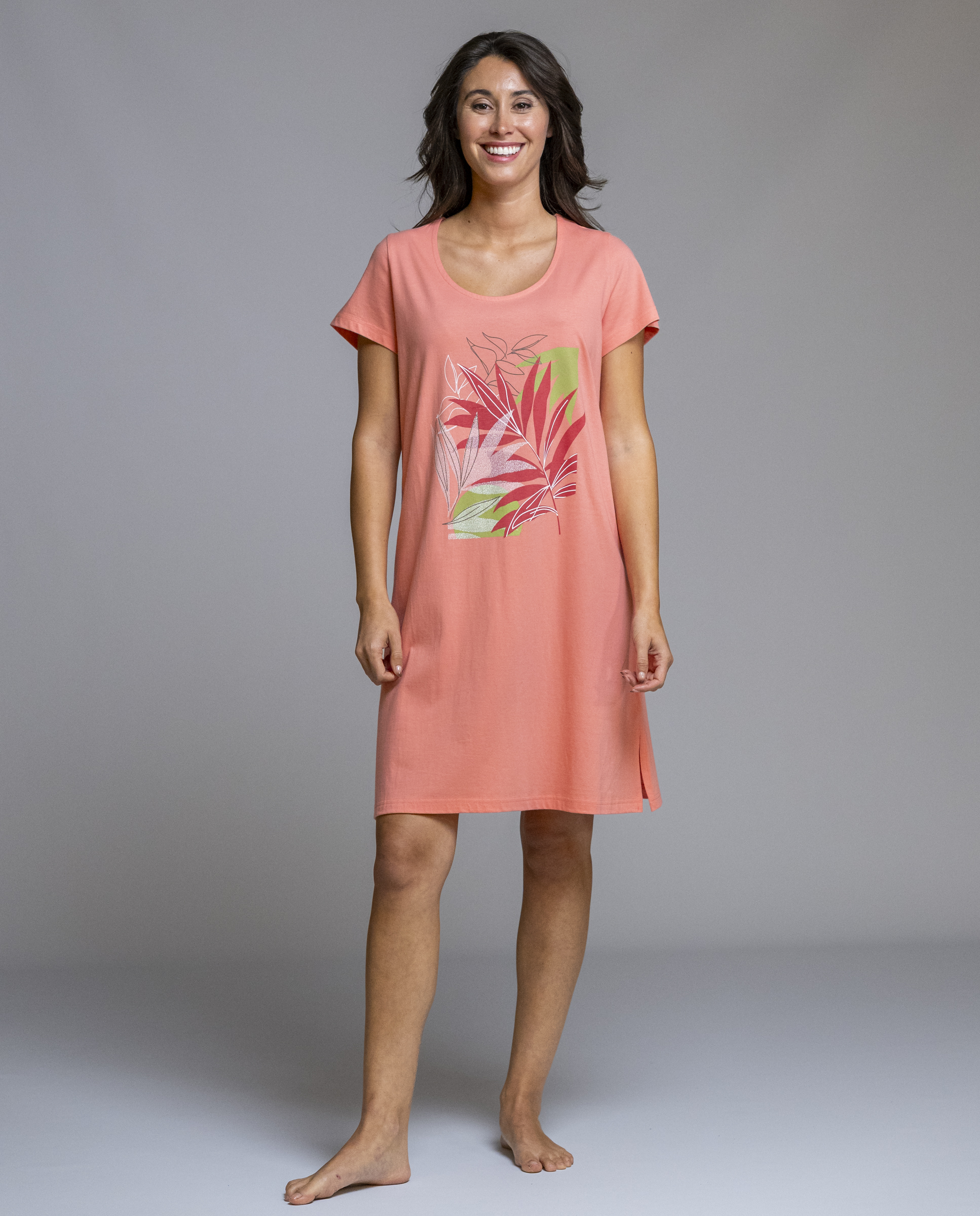 Camisón de mujer de la marca Señoretta, diseñado para ofrecer comodidad sin renunciar a un toque alegre y femenino. Su color coral aporta luminosidad, mientras que el estampado floral delantero le da un aire fresco y actual. Tiene manga corta y un corte recto que resulta muy cómodo para dormir o estar en casa, con un tejido suave y ligero que acompaña bien el movimiento. Una prenda práctica y favorecedora, ideal para las noches de verano o para quienes buscan un camisón cómodo con un diseño bonito.