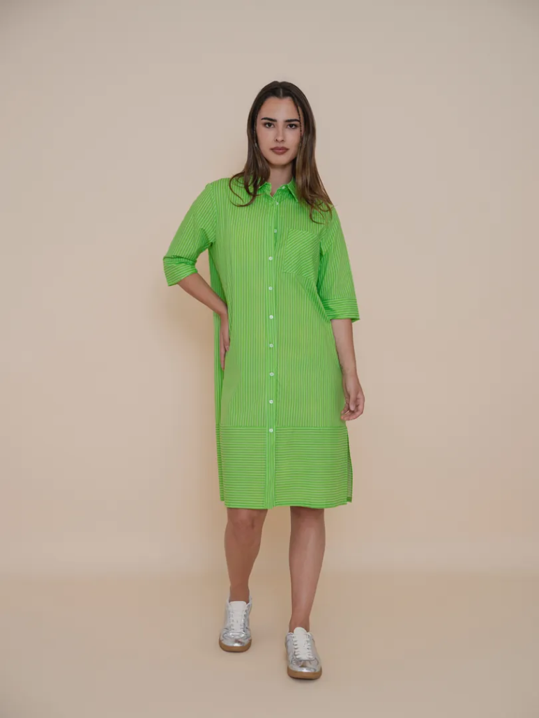 Vestido camisero de mujer de la marca WNT Collection, una prenda fresca y cómoda perfecta para la temporada de primavera-verano. Este modelo destaca por su llamativo color verde con diseño de rayas finas que aporta un estilo moderno y veraniego. Presenta cuello camisero, cierre frontal con botones y manga tres cuartos que puede remangarse fácilmente, ofreciendo un look casual y práctico para el día a día. Su corte recto y su tejido ligero hacen que sea muy agradable de llevar, proporcionando comodidad y libertad de movimiento. Este vestido camisero verde a rayas para mujer es ideal para combinar con zapatillas o sandalias y crear conjuntos frescos y actuales durante los días más cálidos.