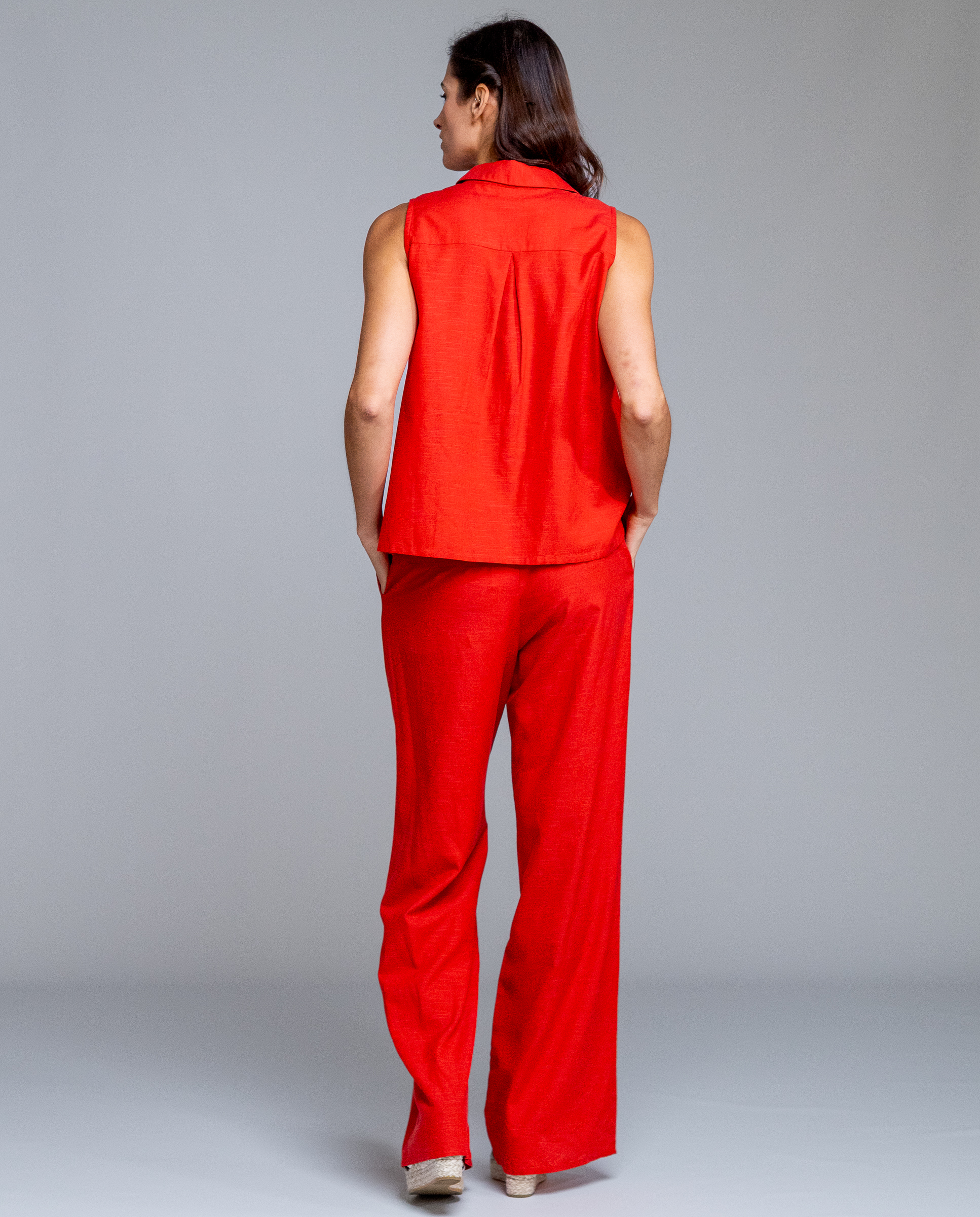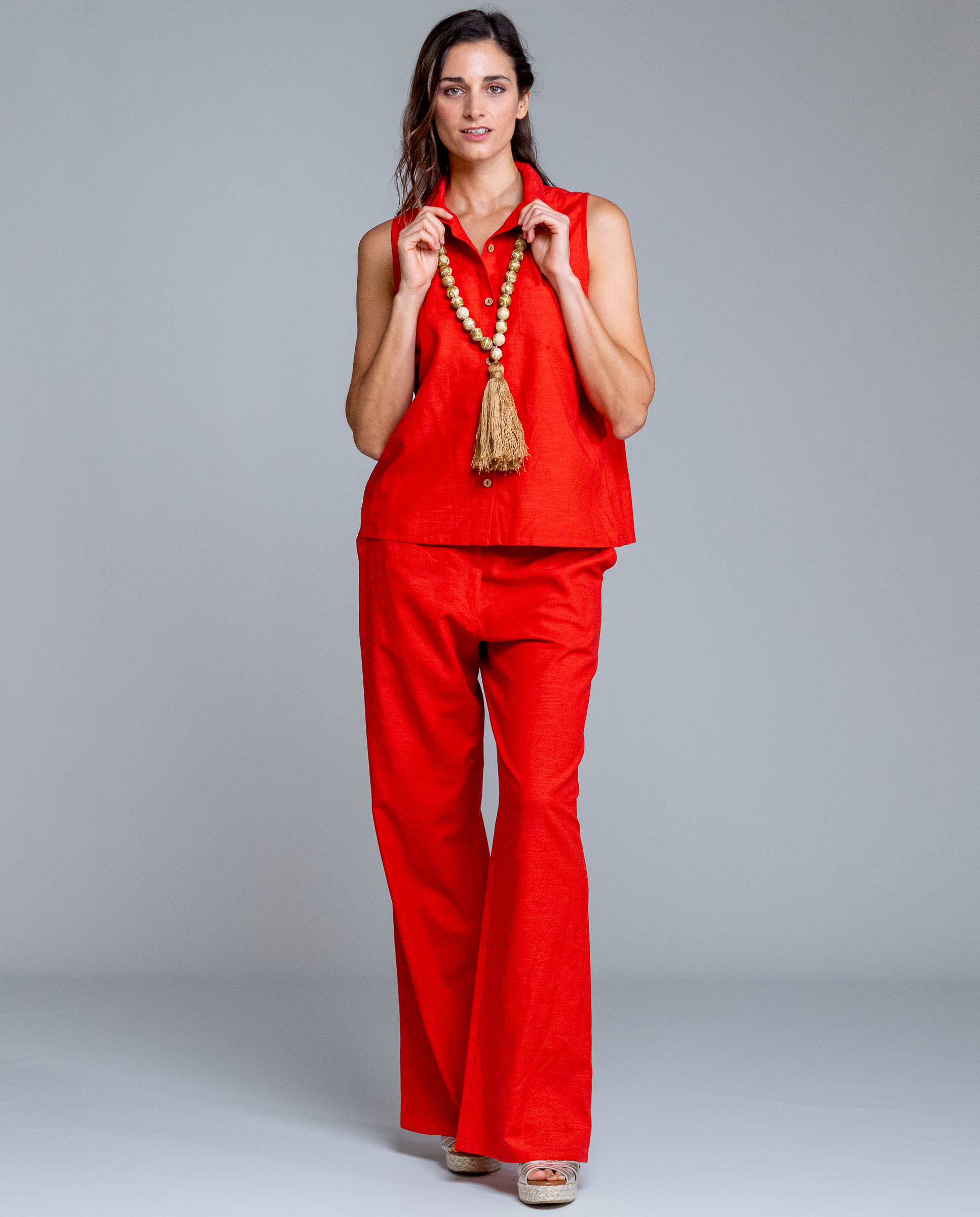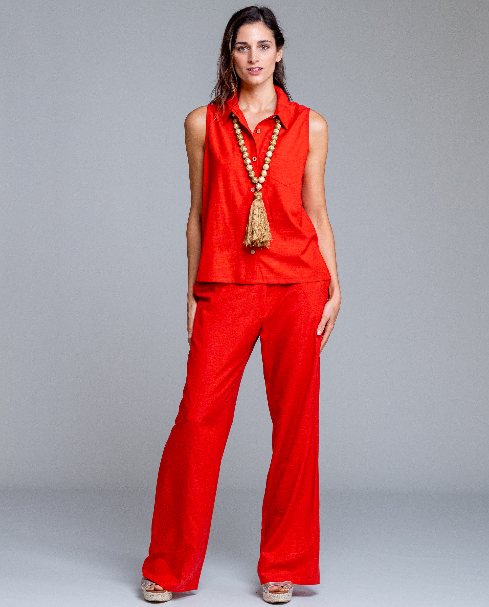 La blusa Brisa de Señoretta destaca por su color rojo intenso y su diseño sin mangas, ideal para los días de calor. Tiene un corte recto y ligero que sienta bien sin marcar, con cuello camisero y botonadura frontal que le da un toque arreglado pero muy fácil de llevar. Es una prenda cómoda, fresca y versátil, perfecta tanto para combinar con el pantalón a juego como con otras prendas lisas de verano.