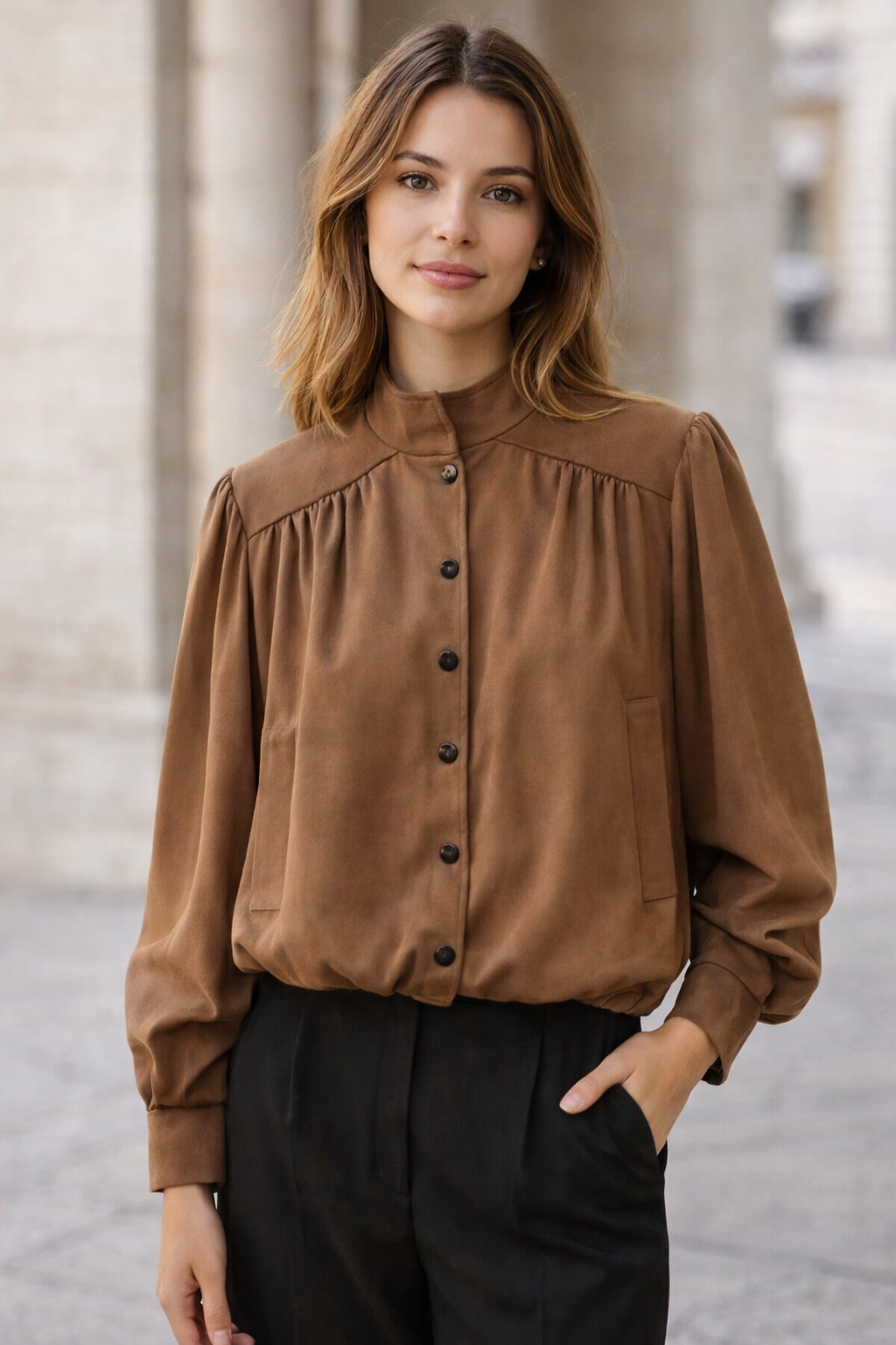 Su tejido de tacto suave tipo ante la convierte en una prenda ideal para entretiempo, fácil de combinar tanto con pantalones como con faldas o vestidos. Es una chaqueta versátil, femenina y práctica, perfecta para completar looks casuales o más arreglados con un toque elegante y moderno.