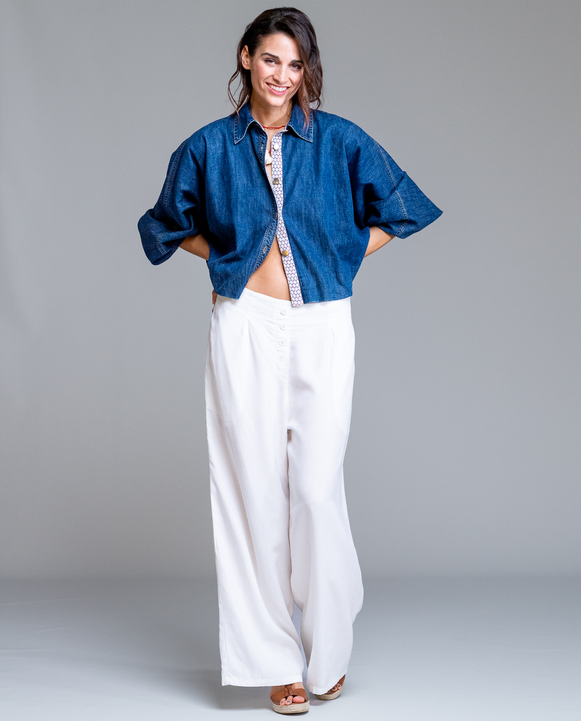 Chaqueta vaquera de estilo corto y amplio, con un aire actual y desenfadado que aporta mucha personalidad a cualquier look. Su diseño con manga amplia y caída suelta la hace muy cómoda de llevar, perfecta para combinar con pantalones fluidos, vestidos o faldas. El tejido vaquero ligero le da ese punto informal que funciona tanto para el día a día como para completar looks más especiales en entretiempo.