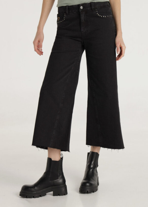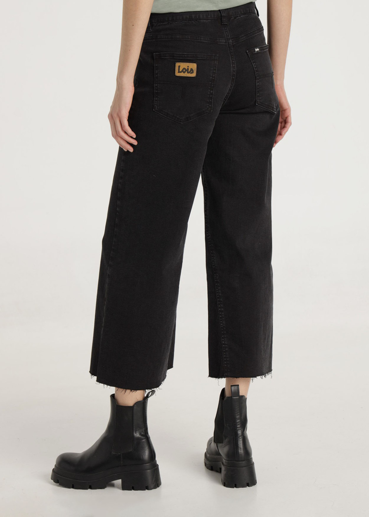 Los jeans mujer Lois VALERIA negro destacan por su corte wide crop fit, actual y favorecedor. Confeccionados en tejido denim de alta calidad, presentan detalles de remaches en los bolsillos delanteros y bajos deshilachados que aportan un toque moderno y desenfadado. Su tiro medio realza la figura manteniendo la comodidad característica de la marca Lois. Perfectos para combinar con botines o mocasines, creando un look urbano con personalidad.