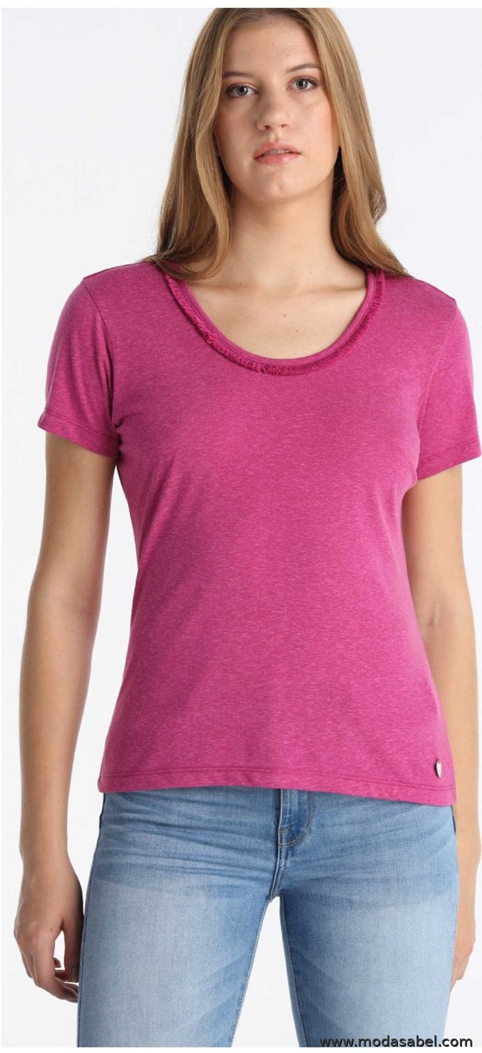 La camiseta de mujer Lois Jeans Lucinda Sabah REF: 423572945 en color fucsia es un básico con un toque diferente que alegra cualquier look. Tiene manga corta y un corte cómodo, perfecto para llevar a diario con vaqueros, shorts o faldas. El detalle especial está en el cuello con flecos, que aporta un acabado original y femenino sin recargar, ideal para darle un punto más “arreglado” a una camiseta sencilla. Una opción genial si buscas una camiseta fucsia de mujer fácil de combinar y con detalle.