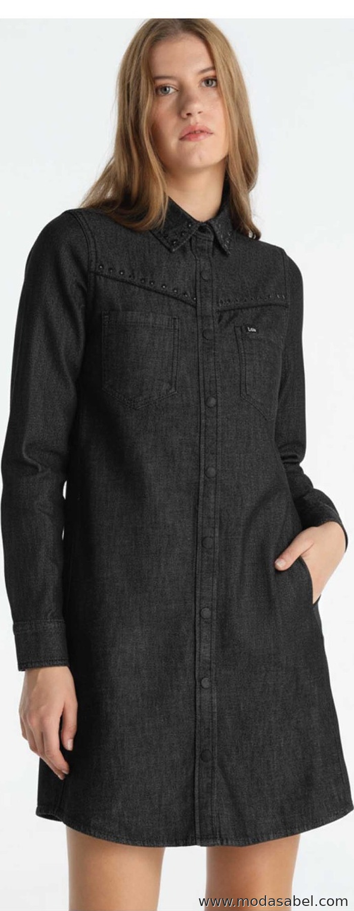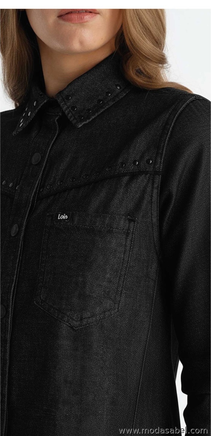 Vestido camisero vaquero de mujer Lois en color negro lavado, con un rollazo muy urbano y fácil de combinar. Lleva cierre frontal con botones tipo presión, cuello camisero y manga larga para un look más pulido, además de dos bolsillos en el pecho. El detalle especial está en las tachuelas decorativas en la zona del canesú, que le dan un toque cañero sin pasarse. Perfecto con zapatillas para diario o con botín para arreglarlo un poco. REF: 448812759.