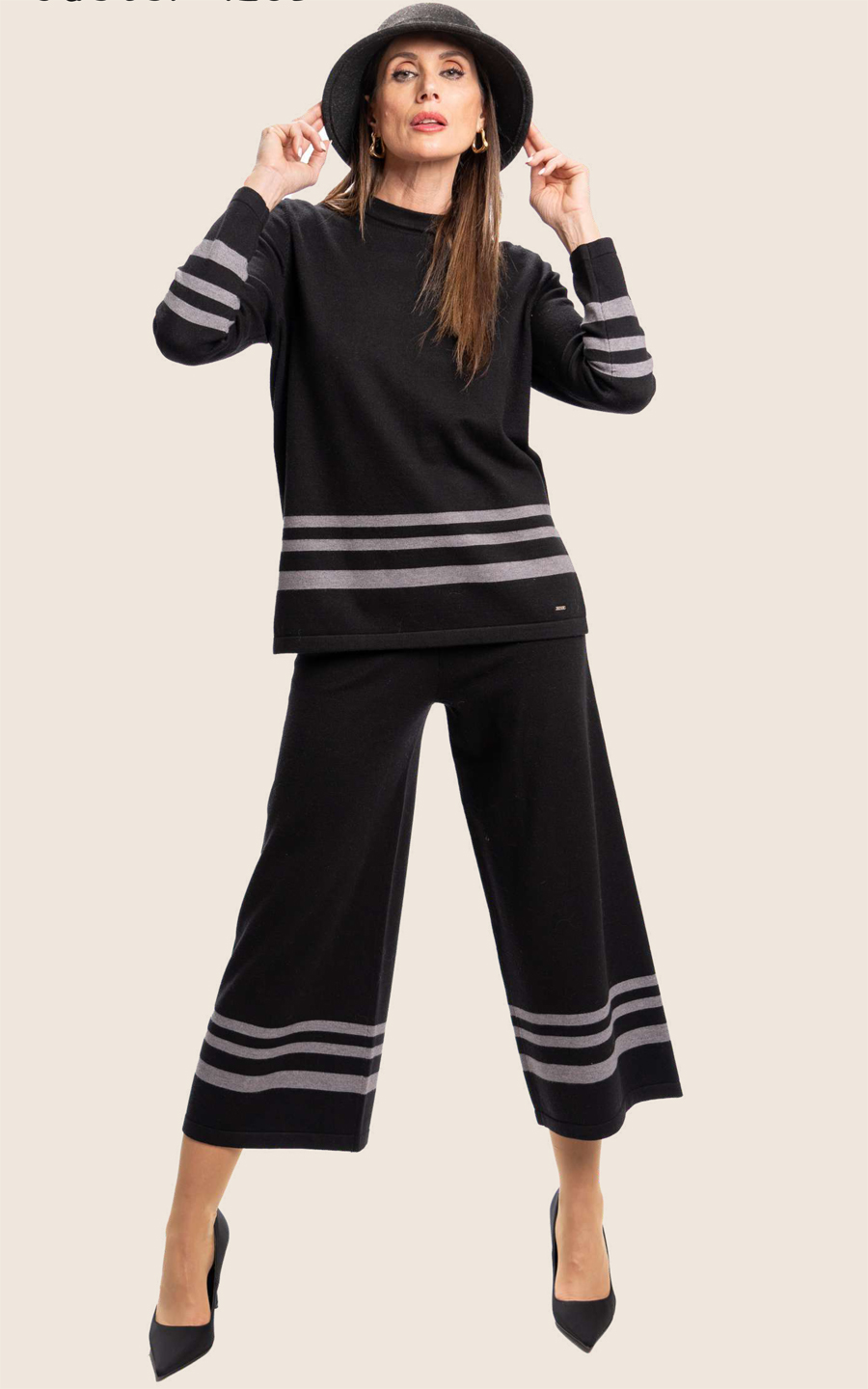 Pantalón de punto para mujer de la marca MCR, fabricante nacional de punto, con pernera ancha y caída fluida que estiliza la figura. Destaca por su comodidad y por el detalle de rayas en el bajo, pensado para combinar con el jersey a juego o llevarlo por separado. Una prenda cómoda, elegante y muy versátil para el día a día.
