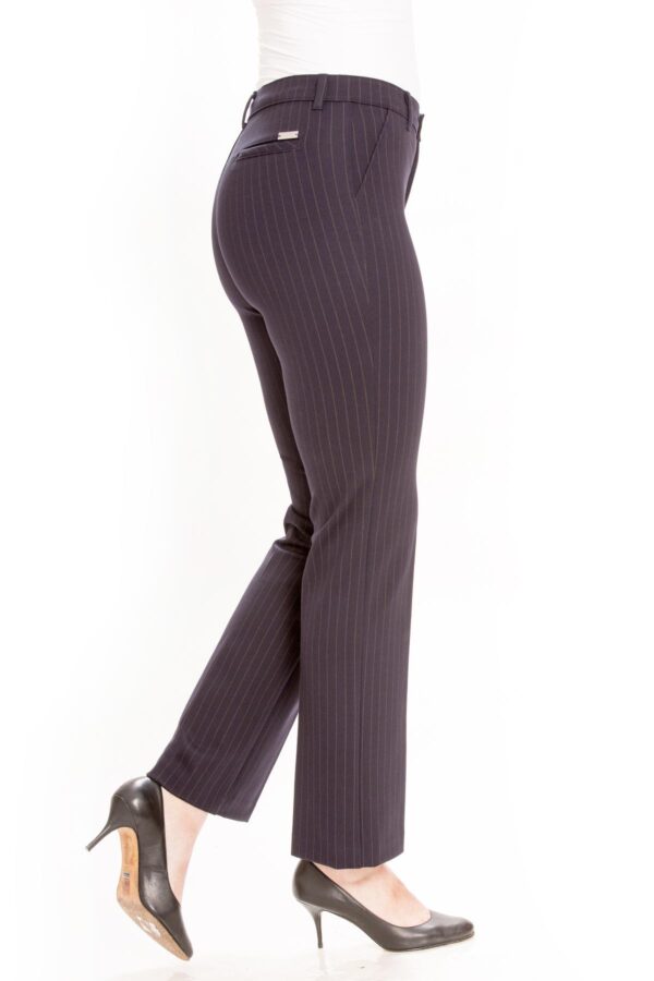 Pantalón de mujer Jarman en color azul marino con elegante raya diplomática en tono claro. Confeccionado en tejido elástico suave y confortable, incorpora goma elástica en la cintura interior que ofrece una sujeción perfecta y una gran comodidad. Su corte recto estiliza la figura, convirtiéndose en una prenda ideal para looks de oficina o para combinar en conjuntos más formales y actuales.
