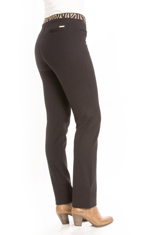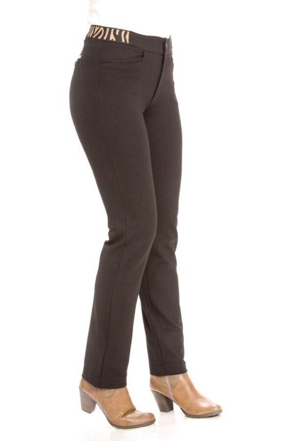 Pantalón de mujer Jarman en color marrón chocolate, confeccionado en tejido elástico de gran suavidad y comodidad. Su diseño ajustado con pierna recta estiliza la figura, mientras que la cintura con estampado animal print aporta un toque moderno y elegante. Una prenda versátil y favorecedora, perfecta para el día a día o para crear un look más arreglado con estilo.