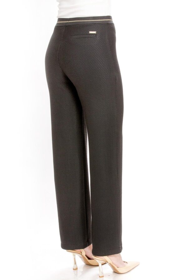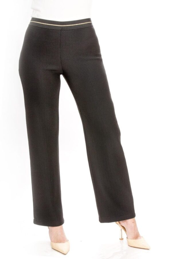 Pantalón de mujer Jarman en color negro, confeccionado en tejido elástico con un elegante dibujo geométrico en relieve. Su corte recto y la cintura elástica con detalle de raya dorada aportan comodidad y un toque moderno a cualquier look. Una prenda versátil y favorecedora, ideal para vestir con estilo y confort en el día a día.