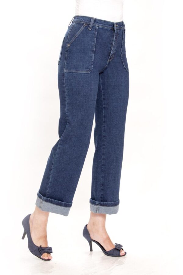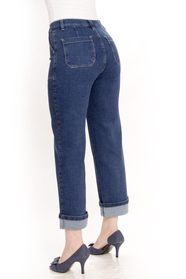 Pantalón tejano de mujer Jarman en color azul medio, confeccionado en tejido elástico que ofrece una gran comodidad. Presenta un diseño actual con vuelta en el bajo y bolsillos amplios en la parte delantera y trasera. Su cintura con goma elástica interior se ajusta suavemente al cuerpo, aportando confort y libertad de movimiento. Un vaquero moderno y favorecedor, ideal para looks casuales de diario.