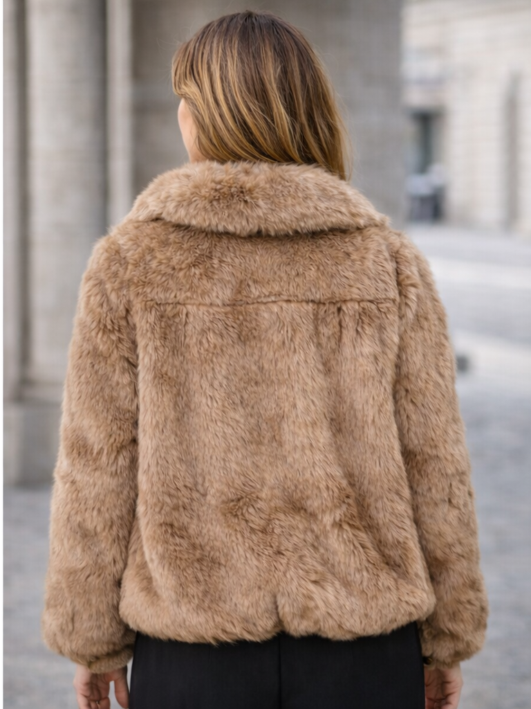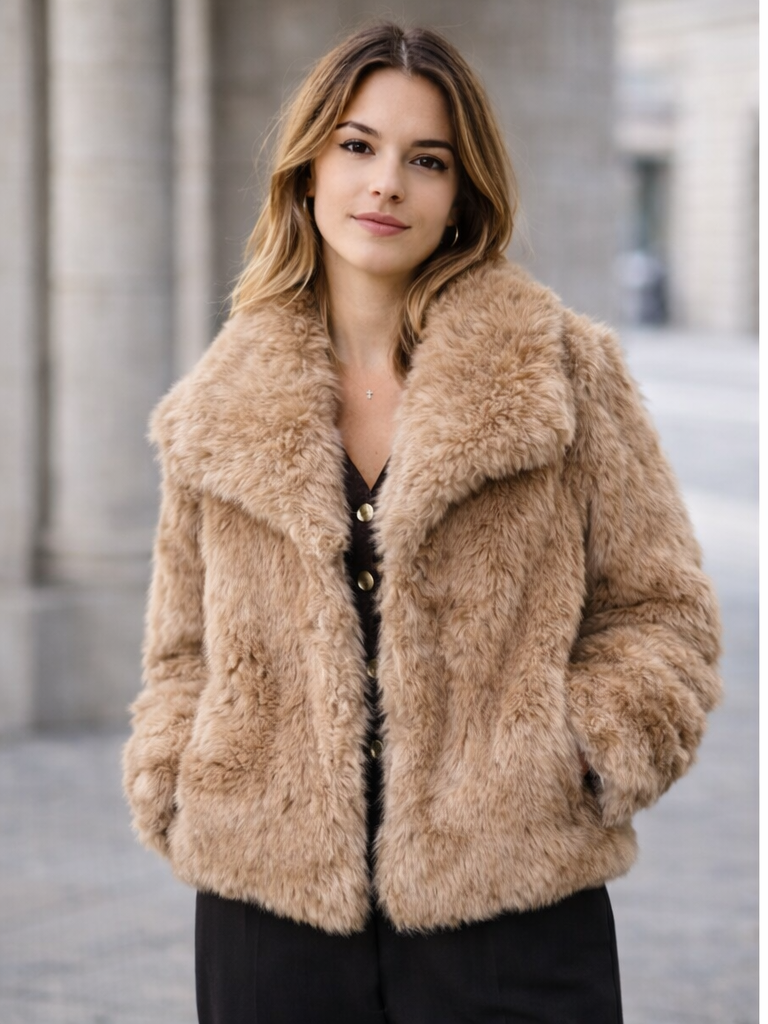 Este abrigo peludo maxi de Reactivo Moda en color camel es un básico imprescindible de la temporada. Su textura suave y agradable tipo pelo proporciona una sensación envolvente y cálida, ideal para los días más fríos. El tono camel aporta elegancia y combina fácilmente con todo tipo de prendas, desde vaqueros hasta looks más arreglados. Cuenta con bolsillos laterales y un diseño cómodo que favorece la silueta. Una chaqueta peluda de mujer perfecta para completar cualquier look de invierno.
