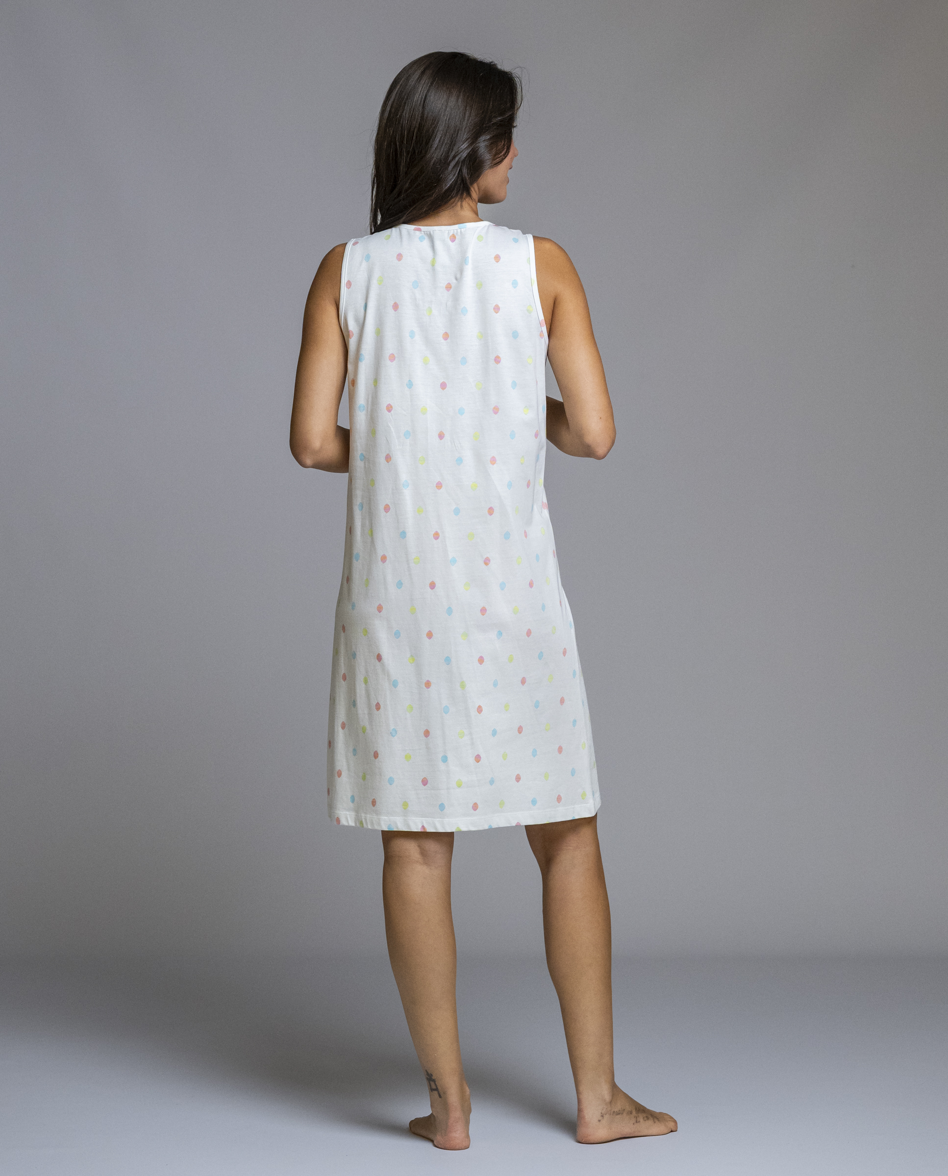 Camisón de mujer Señoretta con un diseño ligero y fresco, ideal para las noches de primavera y verano. Confeccionado en un tejido suave y agradable al tacto, presenta un estampado de pequeños lunares en tonos pastel que aportan un aire delicado y femenino. Su corte recto y sin mangas garantiza comodidad y libertad de movimiento, convirtiéndolo en una prenda perfecta tanto para dormir como para estar en casa con total confort.