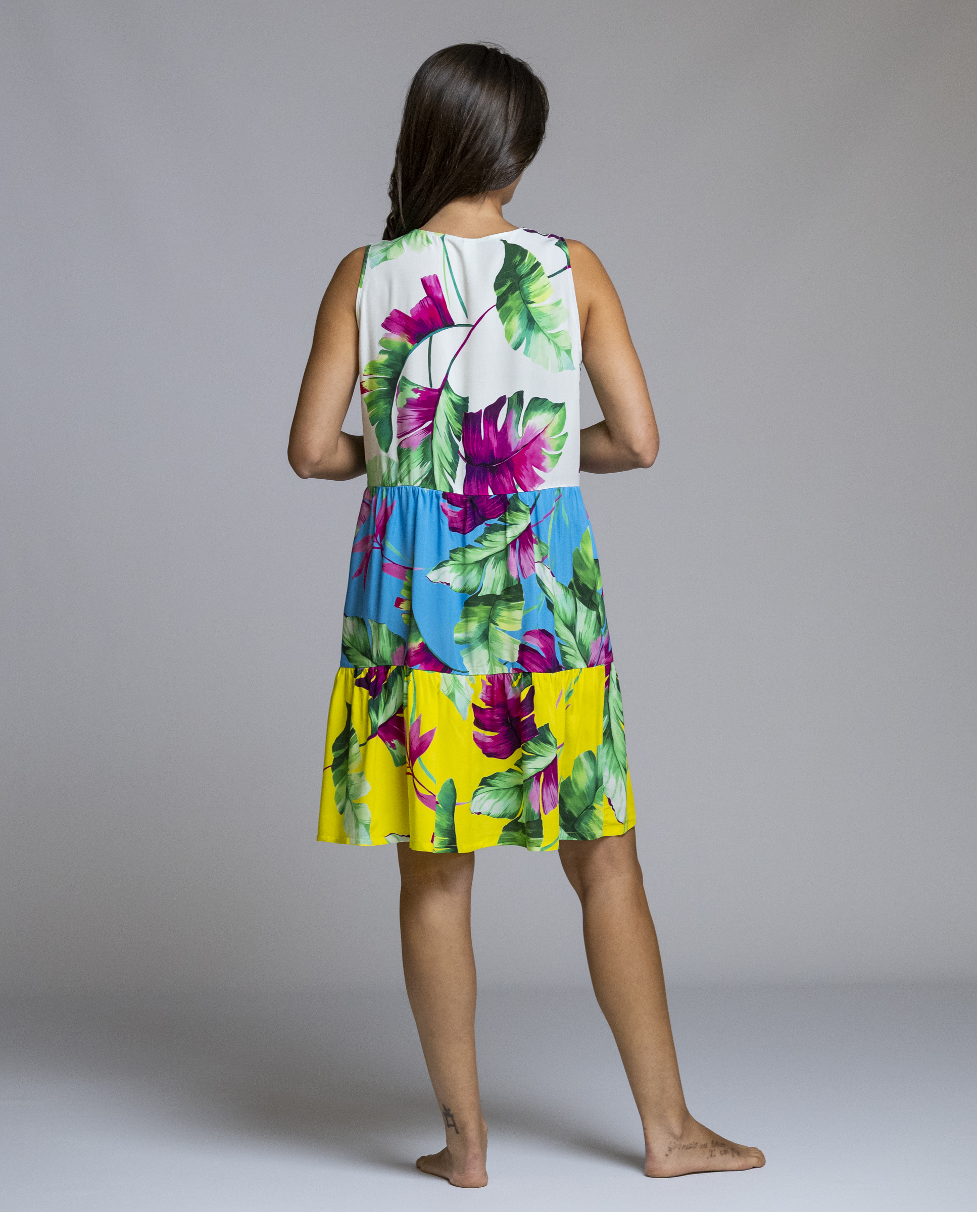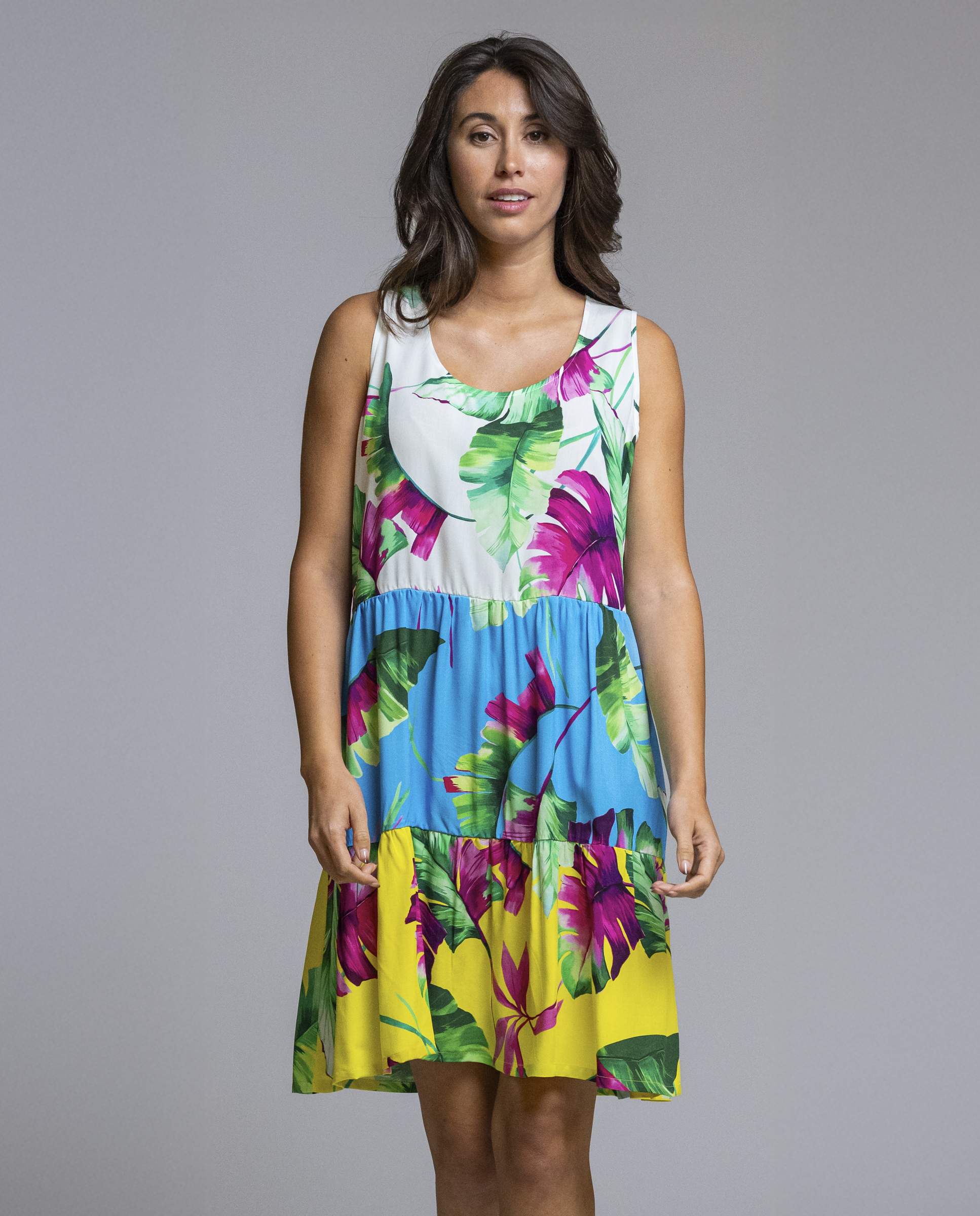 El estampado floral de inspiración tropical, combinado en diferentes tonos, le da un aire alegre y actual sin perder elegancia. Su corte con falda ligeramente evasé y buena caída lo convierte en un vestido cómodo y fácil de llevar, perfecto para crear looks veraniegos relajados pero cuidados. Un diseño de Señoretta pensado para disfrutar del verano con estilo y confort. REF: 261158.