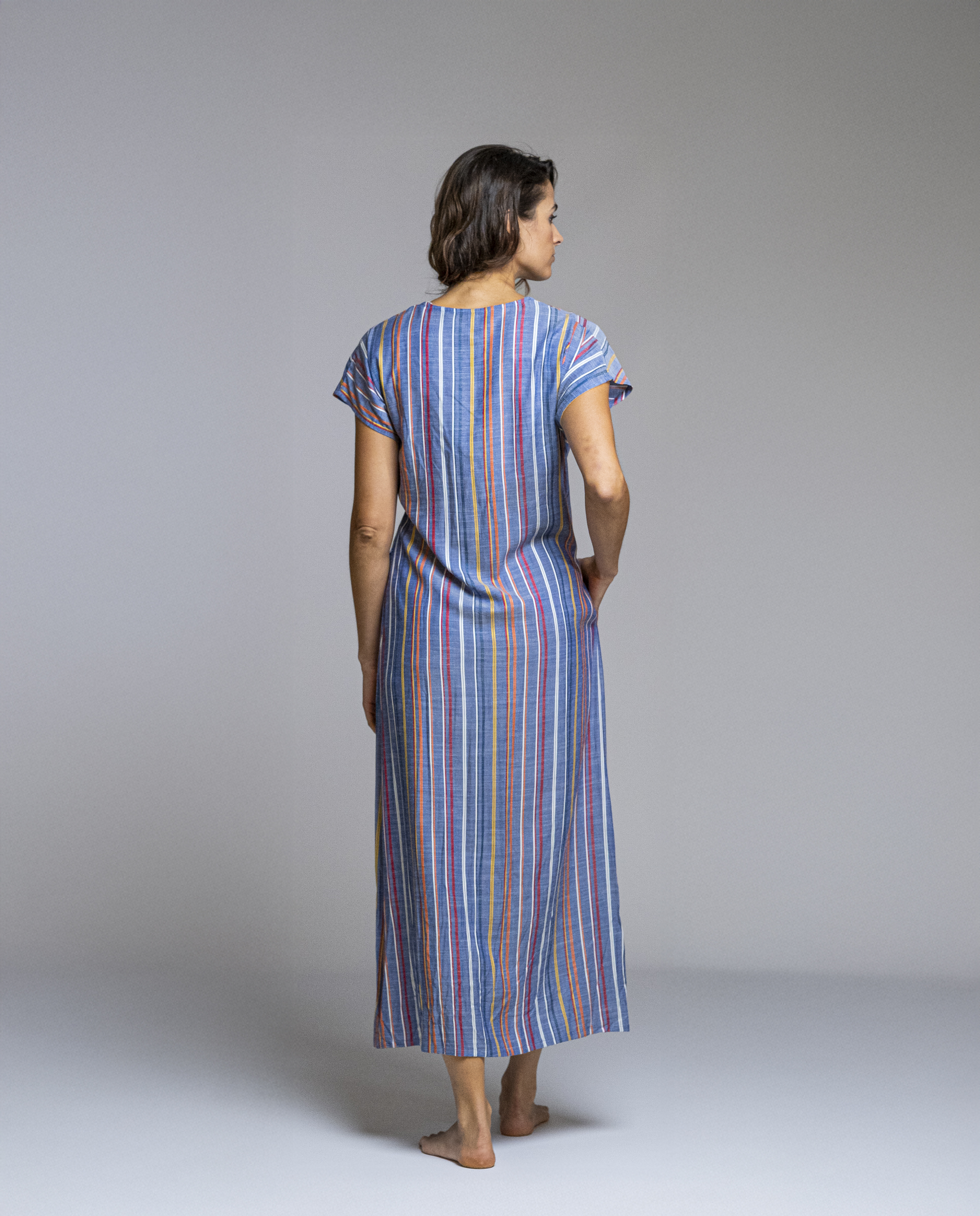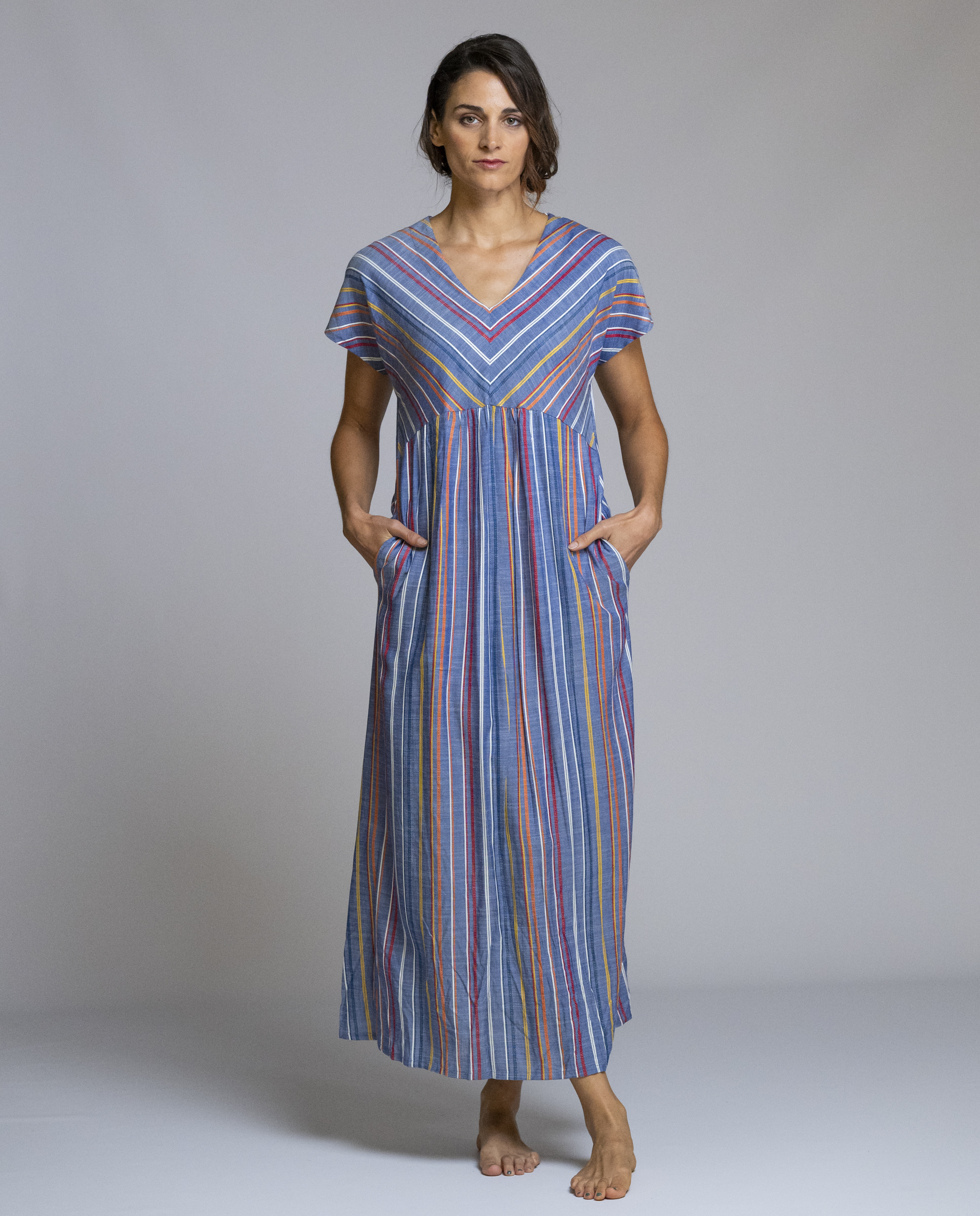 El tejido de rayas verticales en tonos suaves crea un efecto visual que alarga la silueta, mientras que su corte amplio y fluido garantiza comodidad durante todo el día. Incorpora bolsillos laterales que lo hacen aún más práctico y fácil de llevar. Un vestido largo de Señoretta ideal para el día a día, pensado para vestir con naturalidad, frescura y estilo. REF: 261163.