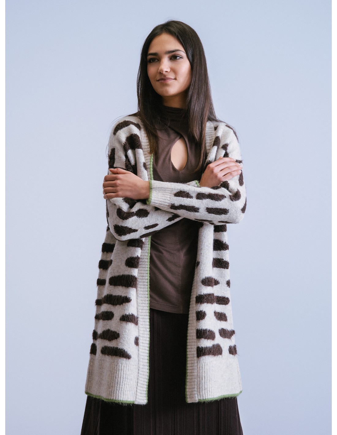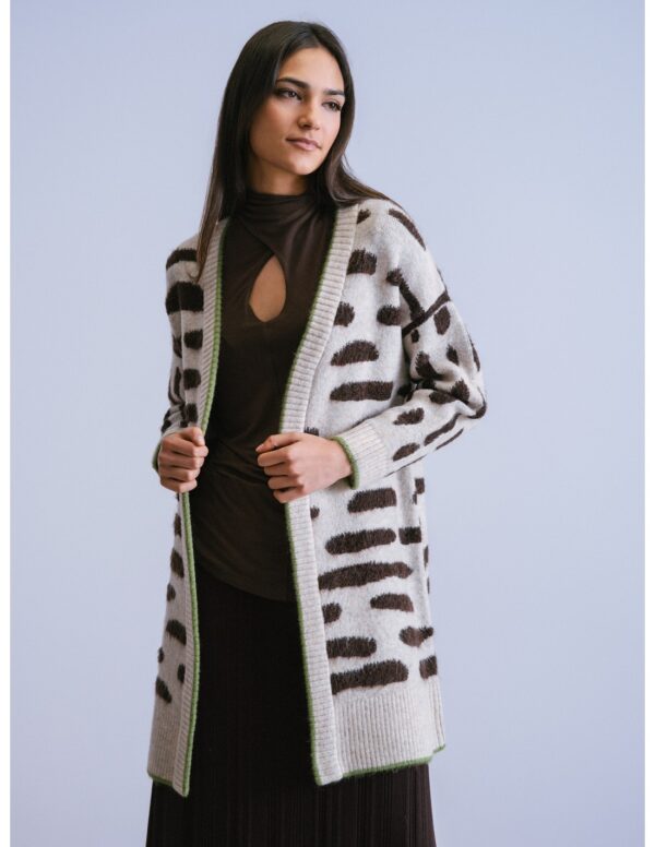 Chaqueta de punto de mujer de la marca WNT Collection, confeccionada en un tejido suave y cálido con diseño en relieve tipo animal print. Su corte largo y su caída fluida aportan un estilo moderno y favorecedor, ideal para combinar con el jersey a juego o con prendas lisas. Lleva un discreto ribete en tono verde que añade un toque original y actual. Perfecta para los días de otoño e invierno, aportando confort y elegancia en cada look.