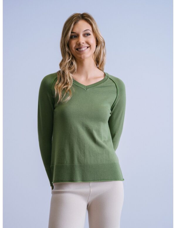 Jersey de mujer de la marca WNT Collection con cuello en pico y diseño liso en color verde. Confeccionado en un punto fino, suave y agradable al tacto, es una prenda esencial para el fondo de armario. Su corte recto con aberturas laterales y los acabados acanalados en puños y bajo aportan comodidad y un toque actual. Ideal para combinar con pantalones o faldas y crear looks sencillos, elegantes y llenos de color.